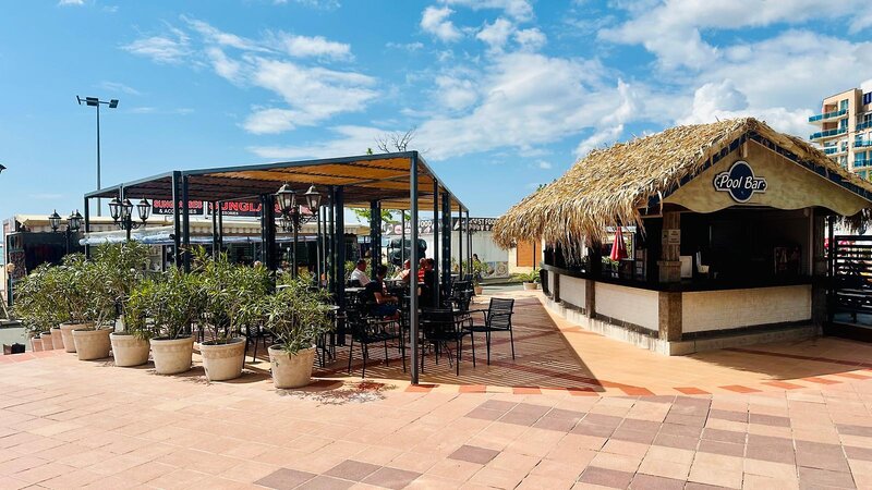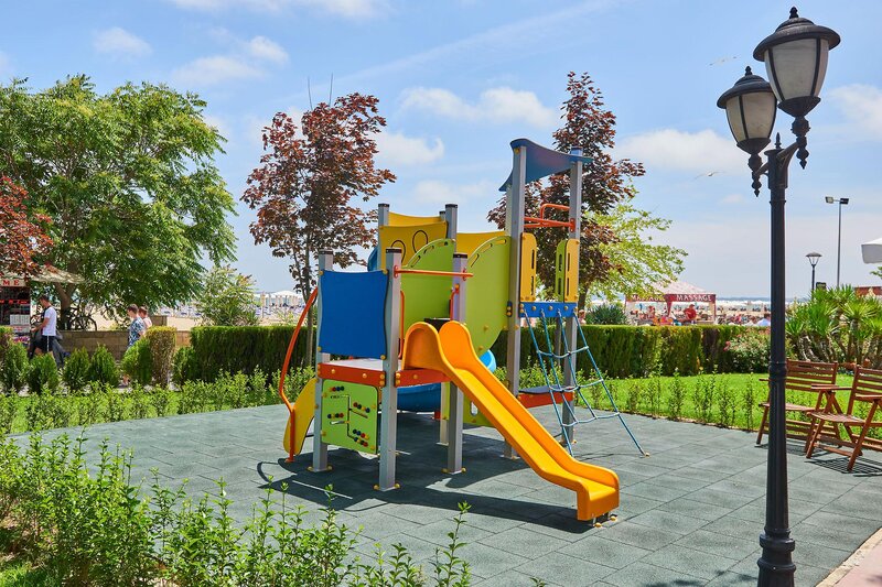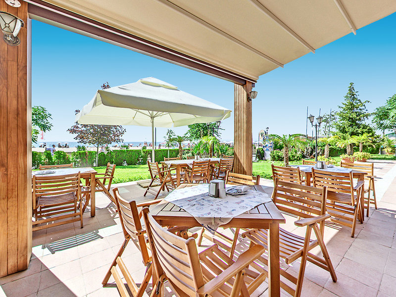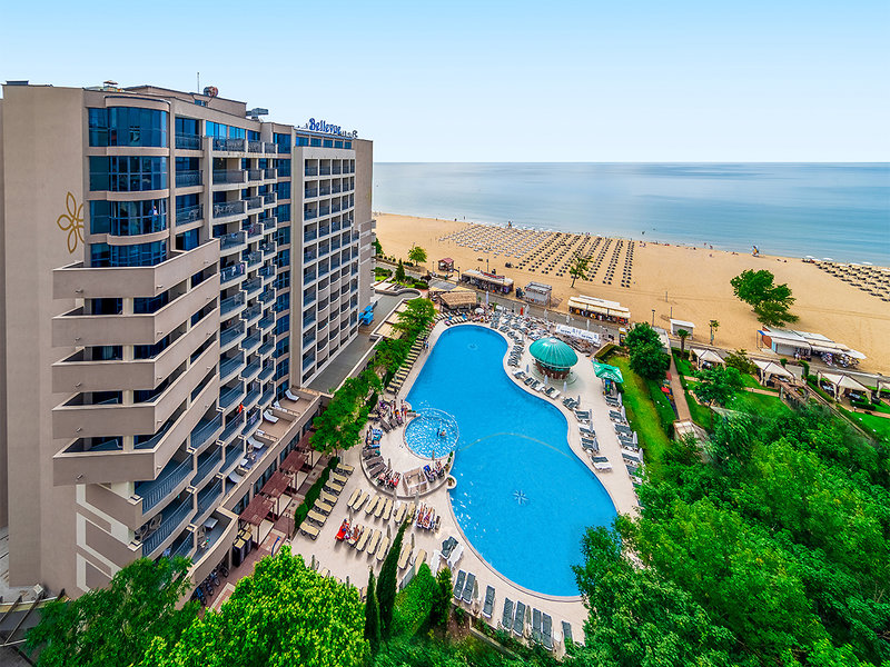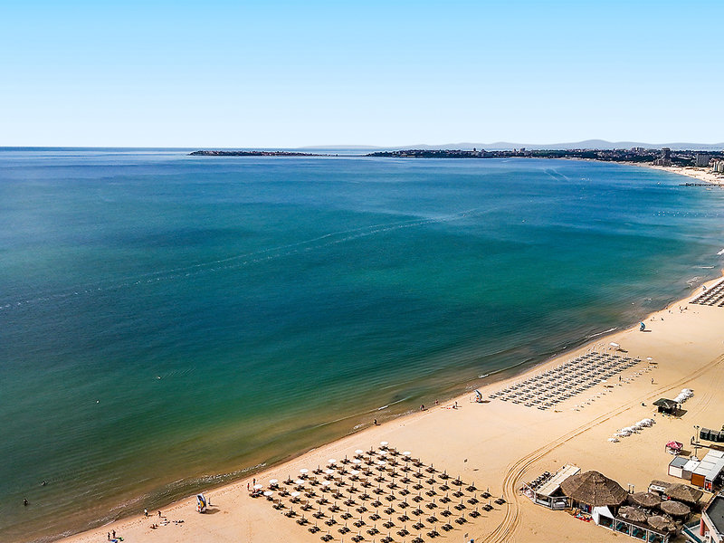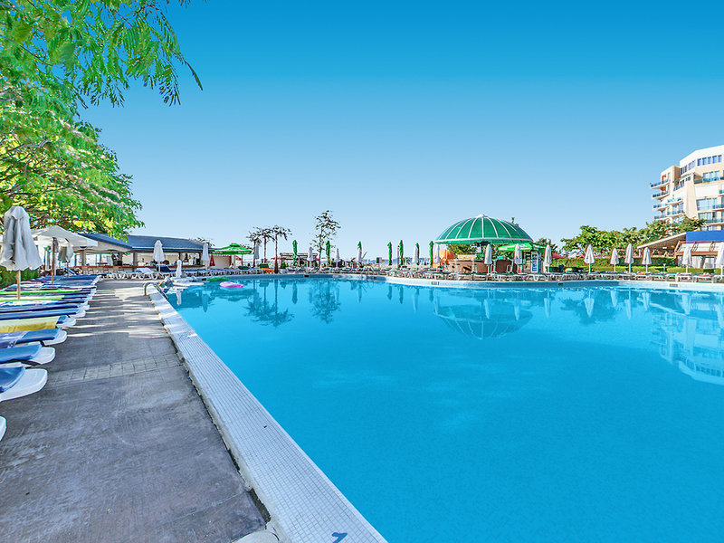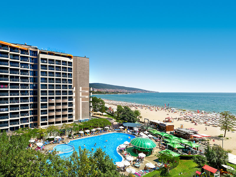 Lage: In 1. Reihe, nur durch die Uferpromenade vom kilometerlangen Sandstrand getrennt. Im ruhigeren Teil von Sonnenstrand, fußläufig können viele Geschäfte, Restaurants und Bars erreicht werden. Das Zentrum des Sonnenstrands befindet sich in etwa 700 m Entfernung südlich des Hotels.