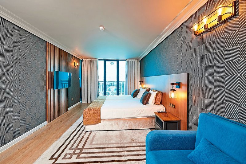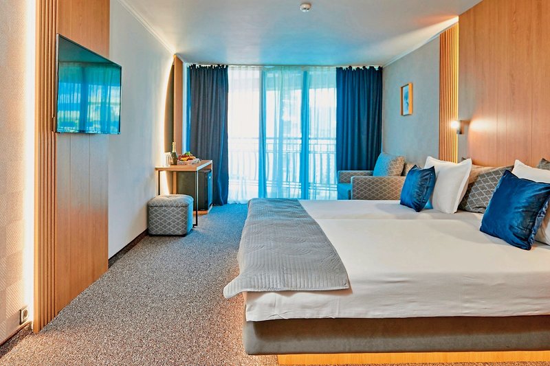 - 21-25 m², dvojlôžková, poschodie, 5., výhľad na more (bočný), zrekonštruované (2024), nefajčiarske, kombinovaná obývacia izba/spálňa, priestor na posedenie, písací stôl, oddelené lôžko (king size), 1 kúpeľňa, sprcha, ručné sprcha, WC, fén, Koberec, klimatizácia, centrálne ovládané, minibar za poplatok, trezor, 1 TV (káblová TV, nemeckojazyčný program, miestny program, iný program, plochá obrazovka), WiFi, balkón alebo terasa (zariadené) , výmena posteľnej bielizne (2x týždenne), výmena uterákov (denne), s posilňovacími zariadeniami (hrazdičky, kardio trenažér, posilňovací box)
