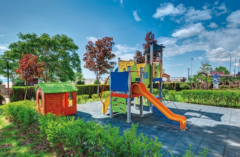- Piesočnatá pláž: mierne sa zvažujúca, verejná, oddelená od komplexu promenádou, slnečníky, ležadlá