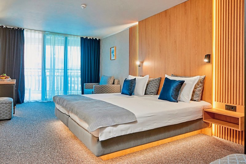 - 21-25 m², dvojlôžková, poschodie, 5., výhľad na more (bočný), zrekonštruované (2024), nefajčiarske, kombinovaná obývacia izba/spálňa, priestor na posedenie, písací stôl, oddelené lôžko (king size), 1 kúpeľňa, sprcha, ručné sprcha, WC, fén, Koberec, klimatizácia, centrálne ovládané, minibar za poplatok, trezor, 1 TV (káblová TV, nemeckojazyčný program, miestny program, iný program, plochá obrazovka), WiFi, balkón alebo terasa (zariadené) , výmena posteľnej bielizne (2x týždenne), výmena uterákov (denne), s posilňovacími zariadeniami (hrazdičky, kardio trenažér, posilňovací box)