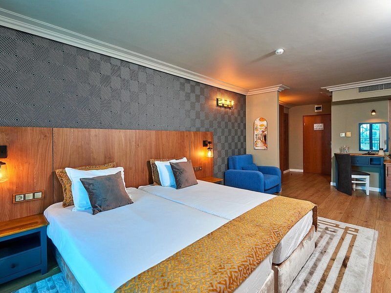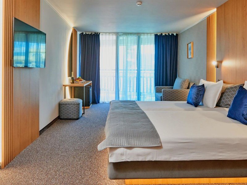 - Rodinná izba (FZX1), rodinná izba, nefajčiarska izba, v hlavnej budove, bočný výhľad na more, posledná čiastočná rekonštrukcia v roku 2016, celkový počet izieb v tomto type izby: 2, rozloženie: 2 spálne, detská postieľka: platba v hotovosti, cca 3 EUR na deň, klimatizácia: bez poplatku, centrálne ovládané, podlaha: koberec, písací stôl, minibar: za poplatok, telefón, internet: WLAN/WiFi: bez poplatku, TV: plochá obrazovka, káblová TV, izbová služba: za poplatok, upratovanie: bez poplatku, sprcha, WC, fén , Balkón: s posedením