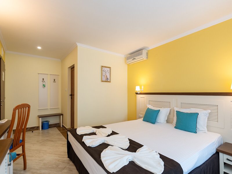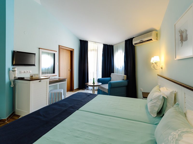 - Dvojlôžková izba štandard (DZX1), nefajčiarska izba, v hlavnej budove, obmedzený výhľad na more, výhľad na more, cca 26 m², posledná kompletná rekonštrukcia 2022, celkový počet izieb tohto typu: 18, 2 samostatné postele (200x100cm), detská postieľka: na vyžiadanie a rezerváciu, klimatizácia: individuálne ovládaná, chladenie, teplo, kúrenie: individuálne ovládané, podlaha: dlažba, trezor, stojaci ventilátor, písací stôl, telefón, internet: Wi-Fi, TV: plochá obrazovka, dokovacia stanica pre iPod, izbová služba, sprcha, vaňa, fén, balkón, balkón alebo terasa, terasa: s ležadlami, s ležadlami, s posedením, spoločná terasa