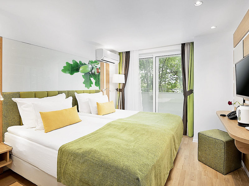 Wohnen: Doppelzimmer (DZ, ca. 25 qm), Klimaanlage, Kühlschrank, Kaffee-/Teeset, TV, Telefon, WLAN, Safe. Dusche, WC und Föhn. Balkon. Max. 2E