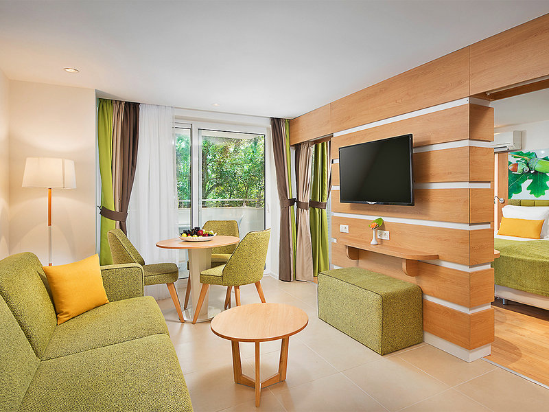 Štúdio Deluxe (ST/SA, cca 48 m²), vizuálne oddelená obývacia/spacia časť, klimatizácia, chladnička, kuchynský kút, jedálenský kút s riadom, príslušenstvo na prípravu kávy/čaju, kávovar (kapsule sa menia denne), 2 televízory, telefón, Wi-Fi, trezor, sprchovací kút, samostatné WC a fén. Balkón. Max. 3 osoby + 1 dieťa