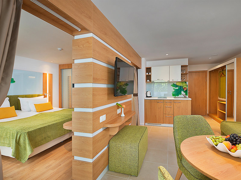 Ausstattung: Weitläufige Hotelanlage mit großer Swimmingpoollandschaft (ca. 700 qm), Sonnenterrasse, Liegen und Schirmen (Badetücher geg. Kaution) und Poolbar. Liegen und Schirme am Strand inklusive. Empfangshalle mit Rezeption, WLAN (an der Rezeption und am Pool), Hauptrestaurant mit Außenterrassen, 3 Bars, 1 kleiner Supermarkt. Landeskategorie: 4 Sterne, 177 Studios, 2-3 Etagen.