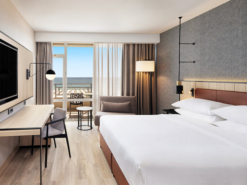 Vybavenie: Tento kompletne zrekonštruovaný (2024/2025) hotel Sheraton ponúka záhradu, bazén so samostatnou detskou časťou, slnečnú terasu, ležadlá a slnečníky pri bazéne a na pláži (v závislosti od dostupnosti) v cene (poukážka k dispozícii), plážové osušky a bar pri bazéne/snack bar s vonkajšou terasou. Hotel ponúka aj recepciu s pohodlným posedením, bezplatné Wi-Fi pripojenie v celom objekte, bufetovú reštauráciu s vonkajšou terasou, lobby bar a športový bar. Oficiálne hodnotenie: 4 hviezdičky, 359 izieb, 8-13 poschodí, výťah.