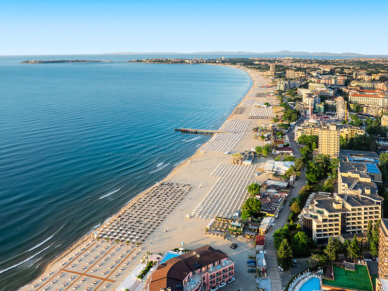 Lage: Zentral im Feriengebiet Sonnenstrand, nur wenige Schritte vom breiten, flach abfallenden Strand entfernt. In direkter Nähe befindet sich die Strandpromenade mit Restaurants, Bars, Clubs, Diskotheken, Cafés und Einkaufsmöglichkeiten. Von hier aus können Sie auch die historische Altstadt von Nessebar erreichen – zum Beispiel mit dem Wassertaxi, der Anlegesteg liegt direkt am Strand vor dem Hotel.