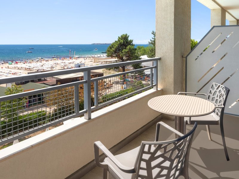 - Deluxe Double/Twin Sea View room (DZM1), Doppelzimmer, Meerblick, eingeschränkter Meerblick, Blick auf Sunny Beach beach area around, ca. 25 m², letzte Komplettrenovierung 2023, Gesamtanzahl der Räume in diesem Zimmertyp: 1, Aufteilung wie folgt: kombiniertes Wohn-/Schlafzimmer, 2 Einzelbetten, 1 Schlafsofa, Babybett: ohne Gebühr, Anfrage & Reservierung notwendig, Klimaanlage: ohne Gebühr, saisonabhängig, individuell regelbar, zentral gesteuert, Fußboden: Laminat, Safe: ohne Gebühr, Schreibtisch, Bügeleisen, Bügelbrett, Kühlschrank: ohne Gebühr, Kaffee-/Teezubereiter, Telefon, Internet: WLAN/WiFi: ohne Gebühr, Fernseher: Flatscreen, im Schlafzimmer, Kabel-TV, Reinigungsservice: täglich, ohne Gebühr, Dusche, WC, Föhn, Kosmetikspiegel, Balkon: mit Sitzgelegenheit
