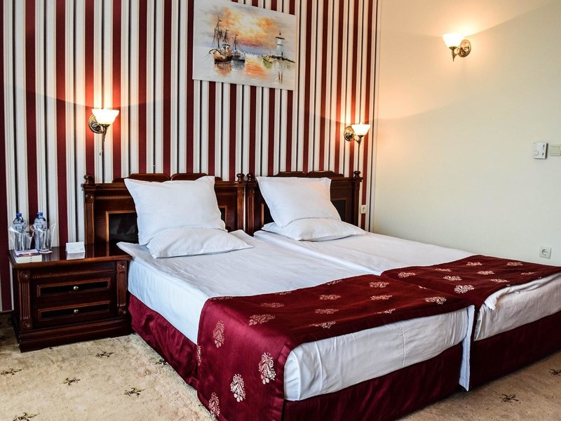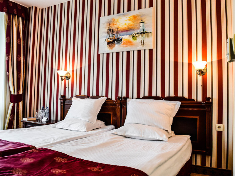 - Dvojlôžková izba s výhľadom na more (DZM1), nefajčiarska izba, v hlavnej budove, výhľad na more, cca 20-22 m², posledná čiastočná rekonštrukcia 2018, celkový počet izieb tohto typu: 1, rozloženie: 1 spálňa, 2 samostatné postele (100x200cm), detská postieľka: k dispozícii za poplatok, nie je potrebná žiadosť ani rezervácia, klimatizácia: bezplatne, individuálne ovládaná, koberec, stojaci ventilátor, písací stôl, telefón, internet: Wi-Fi: bezplatne, TV: plochá obrazovka, nemecké kanály, káblová TV, izbová služba: denne 12:00 - 23:00, za poplatok, upratovacia služba: denne, bezplatne, sprcha, WC, fén, balkón: s posedením