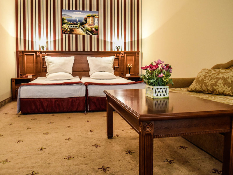 - Junior Suite (JSX1), Junior Suite, Nefajčiarska izba, v hlavnej budove, cca 35-40 m², posledná čiastočná rekonštrukcia 2010, celkový počet izieb tohto typu: 1, dispozícia: kombinovaná obývacia izba/spálňa, 2 samostatné postele (100x200cm), 1 rozkladacia pohovka (100x200cm), detská postieľka: za poplatok, nutná žiadosť a rezervácia, klimatizácia: bezplatne, centrálne ovládaná, podlaha: koberec, stojaci ventilátor, písací stôl, minibar: za poplatok, telefón, internet: Wi-Fi: bezplatne, televízor: plochá obrazovka, v spálni, káblová TV, izbová služba: denne 12:00 - 23:00, za poplatok, upratovacia služba: denne, bezplatne, vaňa alebo sprcha, WC, fén, kozmetické zrkadlo, balkón: s posedením