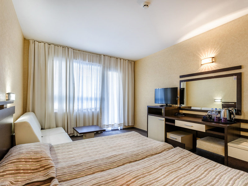 - Dvojlôžková izba Promotion (DZZ1), dvojlôžková izba, v hlavnej budove, orientovaná na krajinu, výhľad na krajinu, výhľad na mesto, cca 18 m², posledná kompletná rekonštrukcia 2008, posledná čiastočná rekonštrukcia 2017, celkový počet izieb v tomto type izby: 1, dispozičné riešenie: kombinovaná obývačka/spálňa, 2 samostatné lôžka, 1 prístelka, detská postieľka: platba v hotovosti, na deň cca 3 EUR, nutná požiadavka, rezervácia nie je nutná, moskytiéra, klimatizácia: zdarma, počasie- závislé, centrálne ovládané, podlaha: koberce, písací stôl, kávovar/čajník, minibar: za poplatok, telefón, internet: WLAN/WiFi, TV: káblová TV, sprcha, vaňa, WC, sušič vlasov, kozmetické zrkadlo, balkón s posedením