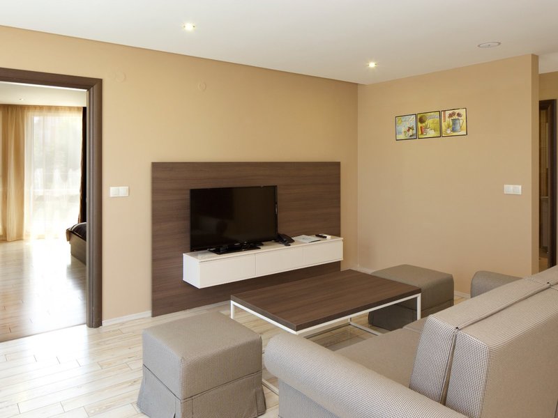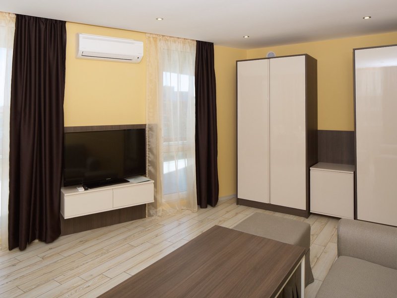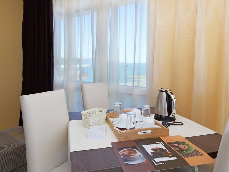 - Jednoizbový apartmán s bočným výhľadom na more (APM1), Apartmán, Nefajčiarska izba, v hlavnej budove, Výhľad na more, čiastočný výhľad na more, cca 55 m², posledná kompletná rekonštrukcia 2016, posledná čiastočná rekonštrukcia 2023, celkový počet izieb v tomto type izby: 2, rozloženie: obývacia izba, 1 spálňa, 1 manželská posteľ (180x195cm), 1 rozkladacia pohovka (155x195cm), klimatizácia: individuálne ovládaná, studená, teplá, podlaha: laminátová, trezor: zadarmo, pohovka, rýchlovarná kanvica, jedálenský stôl, telefón, TV: plochá obrazovka, v obývacej časti, v spálni, nemecké kanály, káblová TV, upratovacia služba: denne, sprcha, WC, papuče, fén, balkón alebo terasa: s posedením