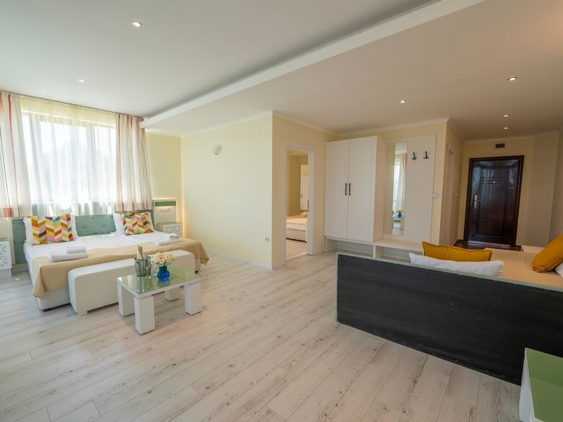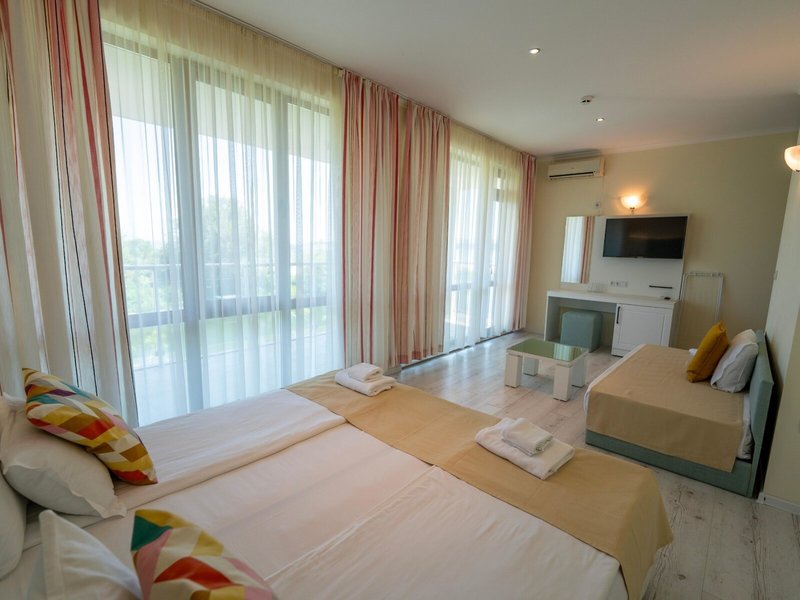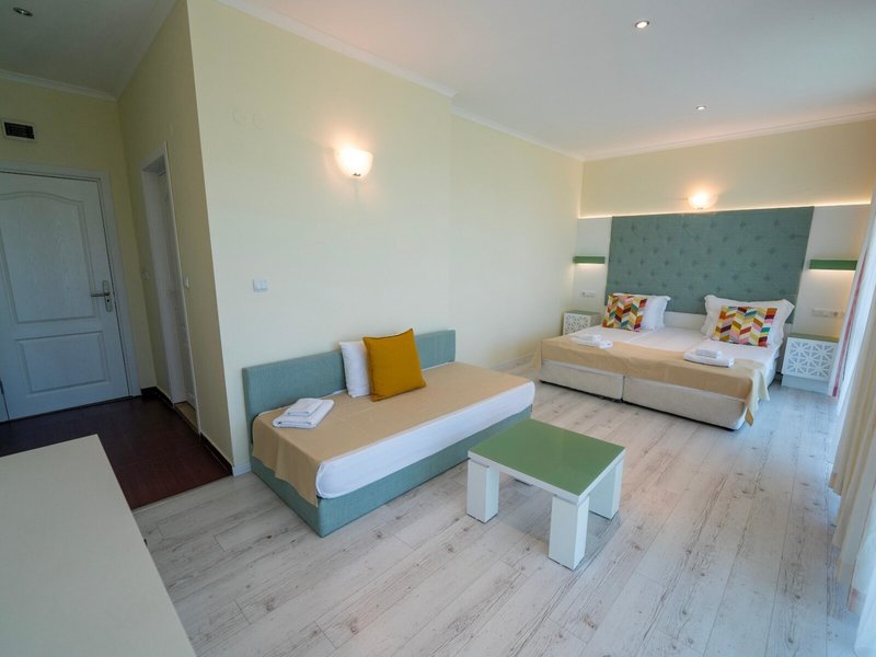 - Rodinná izba Superior (FZM1), Apartmán, Nefajčiarska izba, v hlavnej budove, morská strana, výhľad na more, výhľad na bazén, cca 60 m², posledná kompletná rekonštrukcia 2025, celkový počet izieb tohto typu: 2, rozloženie: kombinovaná obývacia izba/spálňa, 1 spálňa, 2 samostatné postele (90x180cm), 1 manželská posteľ (180x200cm), 1 prístelka (80x160cm), moskytiéra, klimatizácia: bezplatne, individuálne nastaviteľná, centrálne ovládaná, kúrenie: individuálne nastaviteľné, centrálne ovládané, podlaha: laminát, pohovka, písací stôl, minibar: za poplatok, voda: bezplatne, telefón, internet: Wi-Fi: bezplatne, TV: plochá obrazovka, v spálni, nemecké kanály, satelitná TV, izbová služba: denne 8:00 - 20:00, za poplatok, upratovacia služba: denne, bezplatne, sprcha, WC, samostatné WC, fén, balkón: s posedením