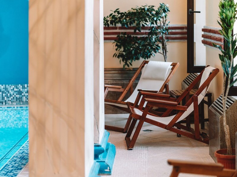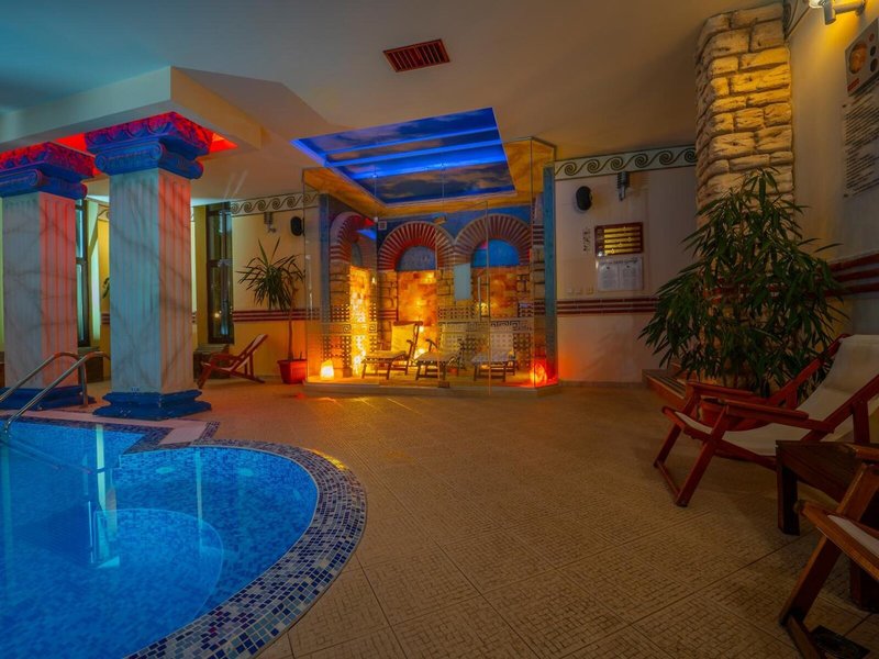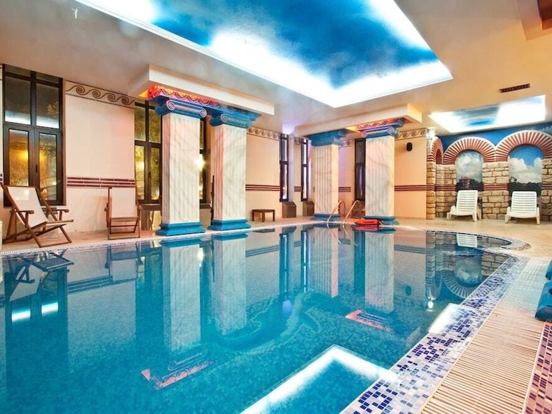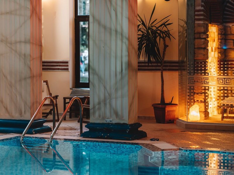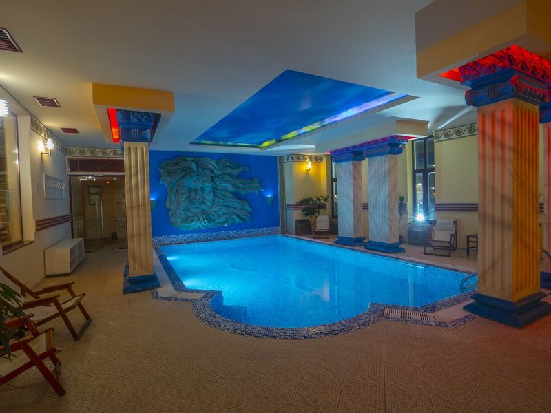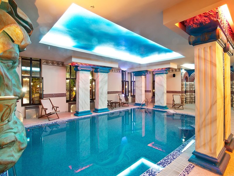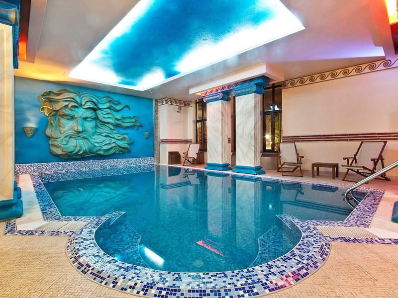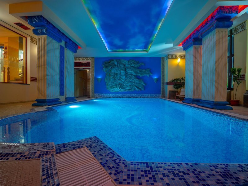 • Bazény: Vnútorný bazén, vonkajší bazén, slnečníky pri bazéne, ležadlá pri bazéne