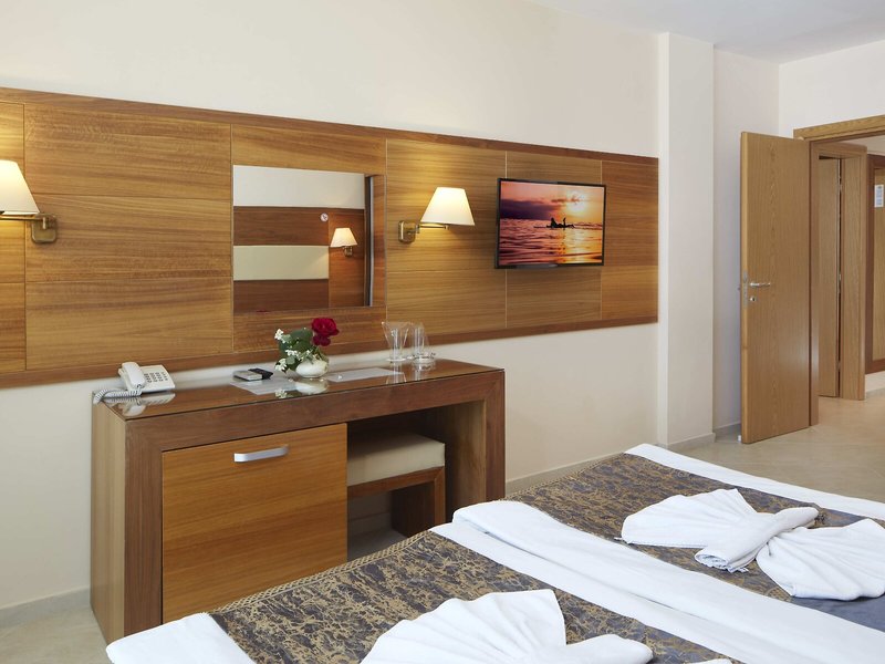 So wohnen Sie: Für angenehmes Raumklima in den Zimmern sorgt eine Klimaanlage. Die Gäste können den Meerblick von Balkon oder Terrasse genießen. Die Zimmer verfügen über ein Doppelbett und ein Sofabett. Es sind separate Schlafzimmer vorhanden. Auch Baby- und Zustellbetten können zur Verfügung gestellt werden. Es gibt eine Minibar. In der Kochnische befinden sich ein Kühlschrank, ein Minikühlschrank und eine Tee-/Kaffeemaschine. Besten Urlaubskomfort bieten ein Telefon mit Direktwahl, ein TV-Gerät mit Satelliten-/Kabelempfang und WiFi (gegen Gebühr). Im Badezimmer, mit einer Dusche und einer Badewanne ausgestattet, stehen für die Gäste ein Haartrockner und Bademäntel bereit. Buchbar sind rollstuhlgerechte Zimmer.