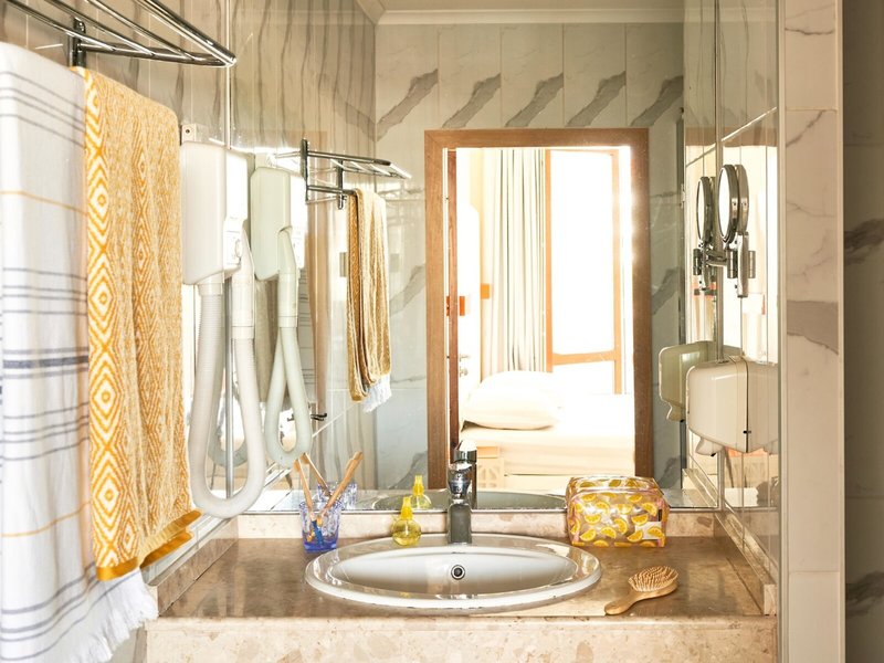 - Apartmán s výhľadom na more (APM1), apartmán, nefajčiarska izba, v hlavnej budove, výhľad na more, výhľad na bazén, cca 45 m², celkový počet izieb v tomto type izby: 2, rozloženie: kombinovaná obývacia izba/spálňa , 1 spálňa, 1 manželská posteľ, 2 prístelky , Detská postieľka: cca 3,50 EUR na deň, nutná požiadavka a rezervácia, klimatizácia: centrálne ovládaná, podlaha: dlažba, laminát, trezor: bez poplatku, rýchlovarná kanvica, minibar: pre za poplatok, telefón, Internet: WLAN/WiFi, TV: plochá obrazovka, v obývacej časti, v spálni, nemecký program, káblová TV, sprcha, WC, fén, kozmetické zrkadlo, balkón: s posedením