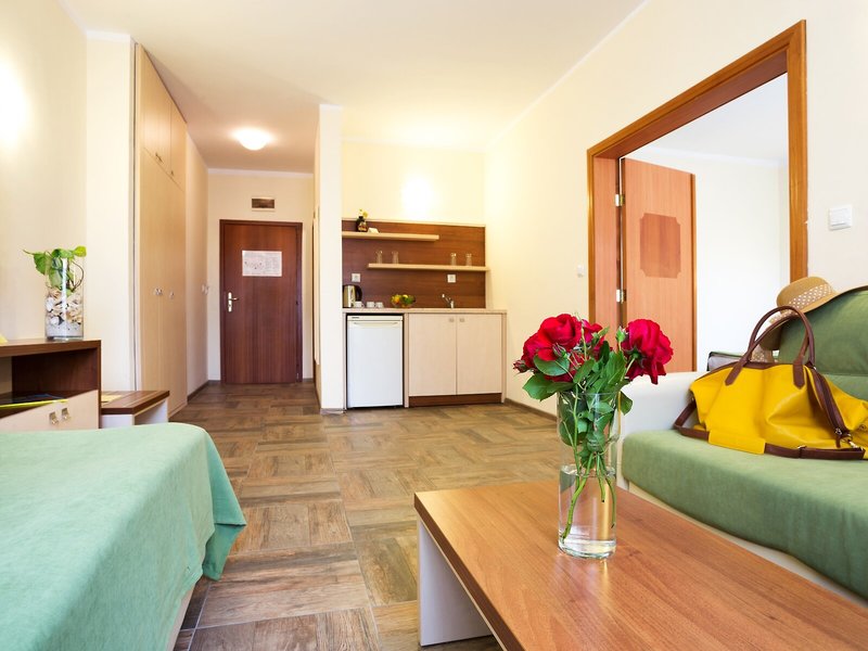So wohnen Sie: In den Zimmern gibt es eine Klimaanlage und eine Heizung. In den meisten Zimmern ist ein Balkon vorhanden. Die Zimmer verfügen über ein Doppelbett oder ein Sofabett. Optional sind separate Schlafzimmer buchbar. Auch Baby- und Zustellbetten können zur Verfügung gestellt werden. Außerdem sind ein Safe und eine Minibar verfügbar. Ein Kühlschrank und eine Tee-/Kaffeemaschine zählen ebenfalls zur Standardeinrichtung. Ein Bügelset ist für den zusätzlichen Komfort der Gäste verfügbar. Darüber hinaus sind ein Telefon, Sat-TV und WiFi (ohne Gebühr) vorhanden. Im Badezimmer, ausgestattet mit einer Dusche und einer Badewanne, gibt es einen Haartrockner. Die Unterbringung bietet Familien- und Nichtraucherzimmer.
