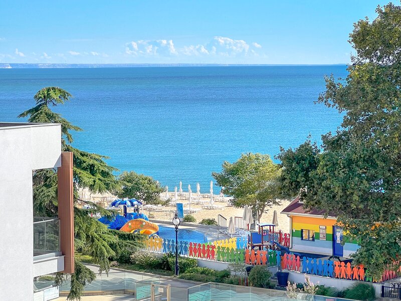 Ausstattung: Stylische Hotelanlage mit Swimmingpool, Sonnenterrasse, Liegen, Schirmen, Badetücher am Pool und am Strand (nach Verfügbarkeit, pro Zimmer ein Schirm u. 2 Liegen am Strand), Poolbar, Snackbar, Strandbar mit Chillout-Bereich. Empfangshalle, Rezeption, WLAN, Buffetrestaurant mit Außenterrasse und Adults-only-Bereich, Sonnenterrasse mit Meerblick (16+) mit Bar, À-la-carte-Restaurant (bulgarische Küche, Reservierung erforderlich), Oldtimer-Eiswagen am Strand, Lobbybar mit Panoramaterrasse, Bluebar. Landeskat.: 4 Sterne, 298 Zimmer, 9 Etagen, Lifte.