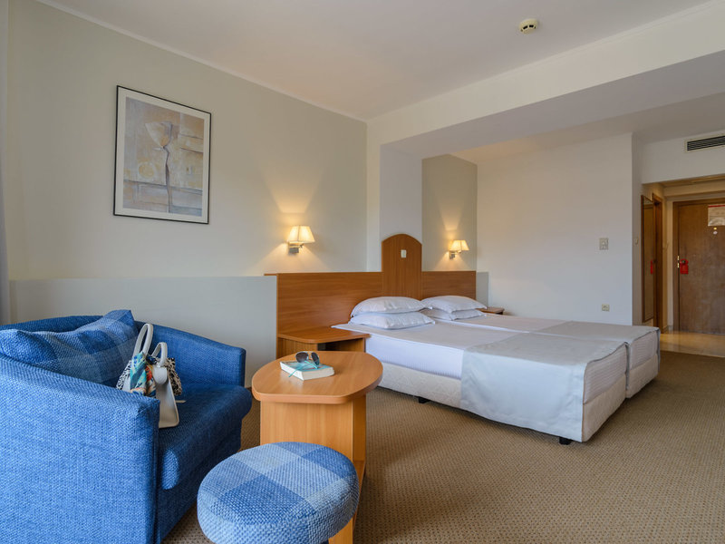 - Junior Suite (JSX1), Junior Suite, Nefajčiarska izba, v hlavnej budove, výhľad na bazén, cca 33 m², posledná čiastočná rekonštrukcia 2015, celkový počet izieb tohto typu: 1, rozloženie: kombinovaná obývacia izba/spálňa, 2 manželské postele, 1 rozkladacia pohovka, detská postieľka: zadarmo, rezervácia nutná, klimatizácia: zadarmo, sezónna, podlaha: laminát, koberec, trezor: zadarmo, pohovka, písací stôl, telefón, internet: Wi-Fi: zadarmo, televízor: káblová TV, upratovacia služba: denne, zadarmo, sprcha, WC, fén, balkón: s posedením