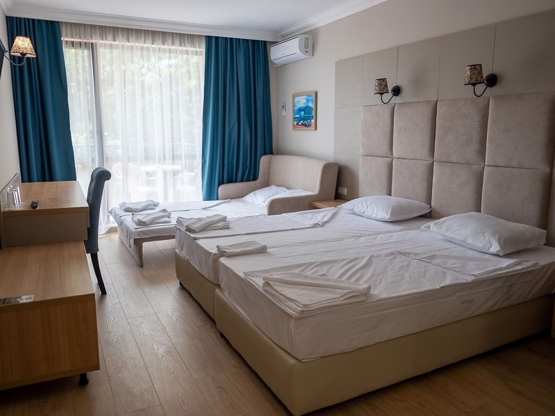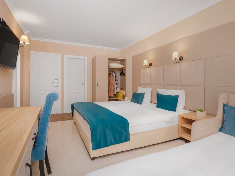 Ubytovanie: Klimatizácia a kúrenie zabezpečujú príjemnú vnútornú klímu. Hostia si môžu vychutnať výhľad na more z balkóna alebo terasy. Izby sú vybavené rozkladacou pohovkou. Pre mladších hostí sú k dispozícii aj detské postieľky. K dispozícii je aj minichladnička a zariadenie na prípravu čaju/kávy. Rôzne možnosti komunikácie a zábavy ponúkajú praktické vybavenie vrátane telefónu, TV a Wi-Fi pripojenia (za poplatok). Kúpeľňa je vybavená sprchovacím kútom a sušičom vlasov. Komplex ponúka rodinné a nefajčiarske izby.