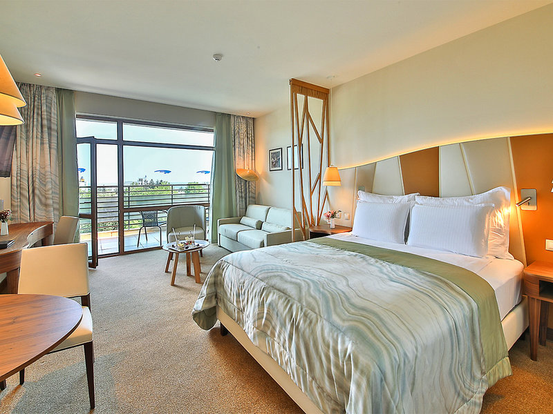 Executive-Studios (SAD, ca. 50 qm), Klimaanlage, Kitchenette, Minibar (geg. Geb.), Kaffee-/Teezubereiter, TV, Telefon, WLAN, Safe. Bad oder Dusche, WC, Föhn, Bademäntel. Balkon, 8./9. Etage, Meerblick. Max. 2E+2K