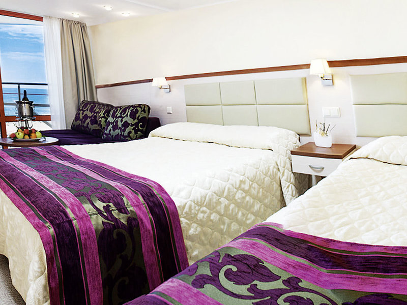 Doppelzimmer (DZ, ca. 20 qm), Klimaanlage, Minibar (tägliche Auffüllung), Kaffee-/Teezubereiter, Telefon, WLAN, TV, Safe. Dusche, WC, Föhn. Balkon mit Meerblick. Max. 3E/2E+2K, zur Alleinnutzung buchbar (EZ)