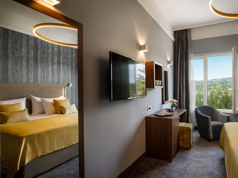 - Superior Double Balcony Seaside (DZX7), dvojlôžková izba, v hlavnej budove, morská strana, cca 18 - 24 m², posledná kompletná rekonštrukcia v roku 2018, 1 manželská posteľ (180x200cm), klimatizácia: individuálne nastaviteľná, studená, teplá, kúrenie. , podlaha: koberec, trezor, písací stôl , Minibar: za poplatok, telefón, Internet: WLAN/WiFi: bez poplatku, televízor: v spálni, satelitná TV, izbová služba: proti Za poplatok, sprcha, WC, fén, balkón, balkón alebo terasa