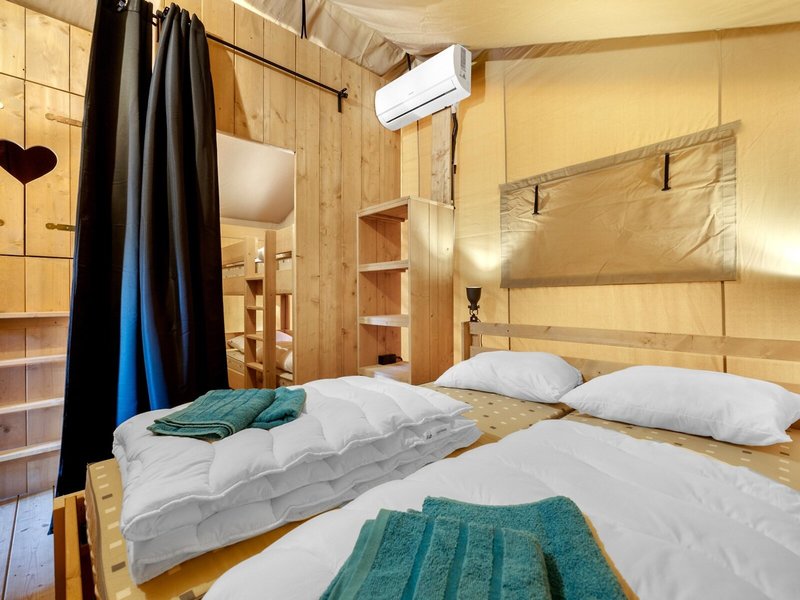 - Glamping tent with sanitary + airco (ZZX1), Zelt, Nichtraucherzimmer, Gartenseite, Gartenblick, Parkblick, ca. 35 m², 3 Schlafzimmer, 2 Einzelbetten (80x200cm), 1 Doppelbett (160x200cm), 1 Queen Size Bett (160x200cm), Klimaanlage: ohne Gebühr, individuell regelbar, kalt, warm, Heizung: individuell regelbar, Fußbodenheizung, Fußboden: Fliesenboden, Kochnische, Kühlschrank, Gas/E-Herd, Mikrowelle, Kaffeemaschine, Kaffee-/Teezubereiter, Esstisch, Internet: WLAN/WiFi: ohne Gebühr, Dusche, WC, Terrasse: mit Liegestühlen, Veranda