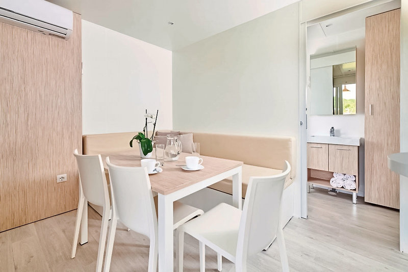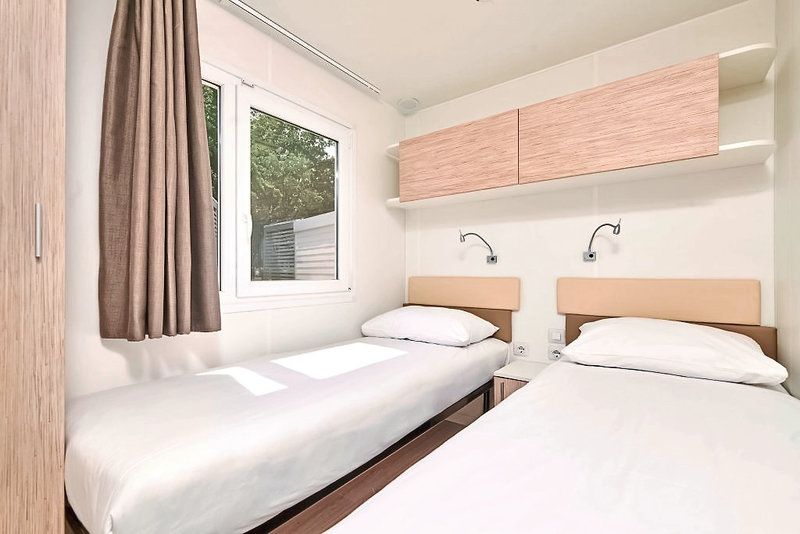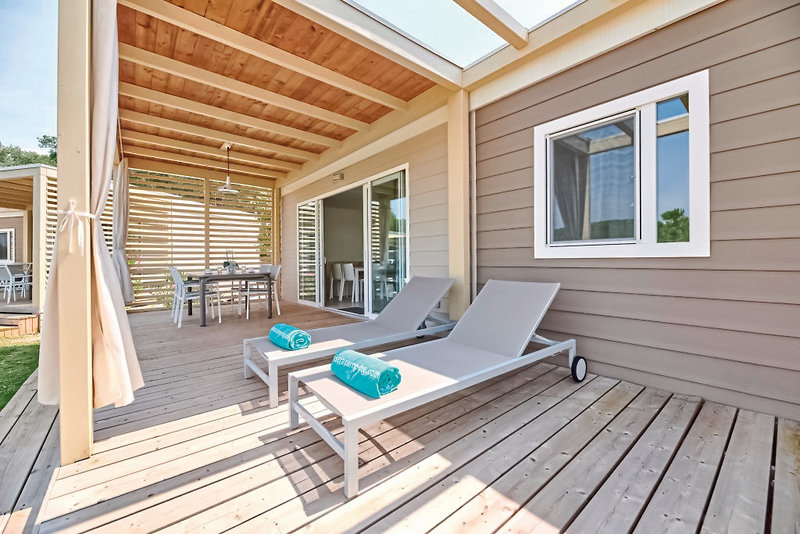 - 31-35 m², Mobilný domček, Superior, 2 samostatné spálne, kombinovaná obývacia/spacia časť, posedenie, 2 jednolôžka, manželská posteľ, rozkladacia pohovka, 2 kúpeľne, sprchovací kút, WC, klimatizácia, trezor, TV, kuchynský kút, jedálenský kút, terasa (zariadená, krytá), 1 parkovacie miesto na jednotku, posteľná bielizeň poskytovaná zdarma, výmena posteľnej bielizne (raz týždenne), uteráky poskytované zadarmo, výmena uterákov (raz týždenne), kuchynské utierky je potrebné priniesť so sebou, náklady na energie (zdarma), záverečné upratovanie (už zahrnuté v celkovej cene)