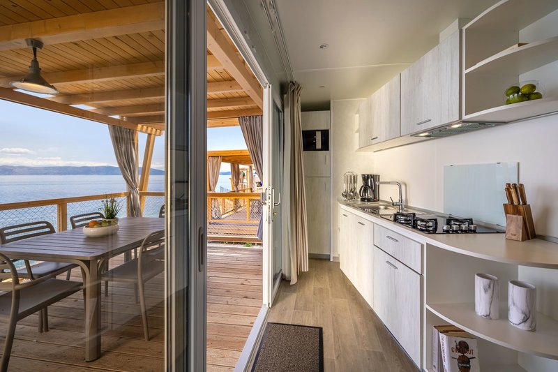 Prémiové mobilné domy: Prémiové mobilné domy zaujmú dostatkom priestoru, majú dve spálne a dve kúpeľne so sprchovacími kútmi. Vonkajšia terasa ponúka posedenie a ležadlá. Kuchynský kút je plne vybavený mikrovlnnou rúrou/rúrou. Obývacia izba ponúka pohodlnú pohovku a satelitnú TV (cca 32 m², WMP).