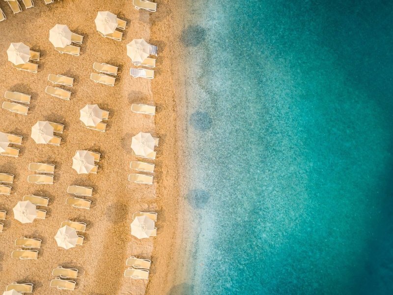 - Pláž: skalnatá, kamienková, prírodná, ležadlá: za poplatok, slnečníky: za poplatok
