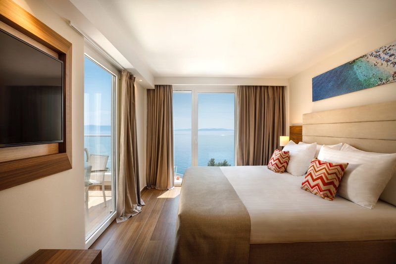 Suita Sea View Maro Suity: Sú o niečo väčšie ako rodinná suita, cca 51 m² a inak s rovnakým vybavením a minimálnou obsadenosťou ako rodinná suita Superior Sea View, pozostávajú z dvoch kúpeľní, jednej s vaňou vhodnou pre deti a detskej. stolička a kúpeľňa so sprchovacím kútom. Suita má tiež spálňu s manželskou posteľou, ďalšiu spálňu s 2 samostatnými lôžkami a otvorenú obývaciu izbu s rozkladacou pohovkou a ďalšou terasou a výhľadom na more (SM).
