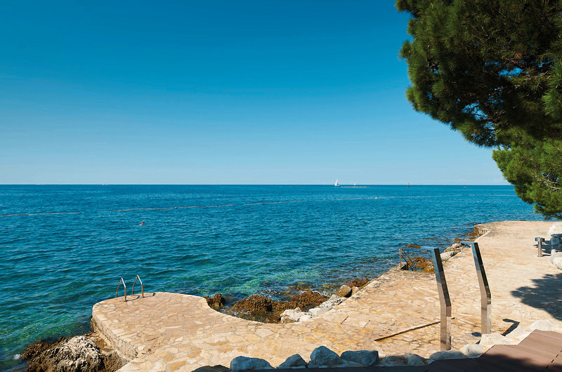 - Kiesstrand: flach abfallend, Sonnenschirme, Liegen