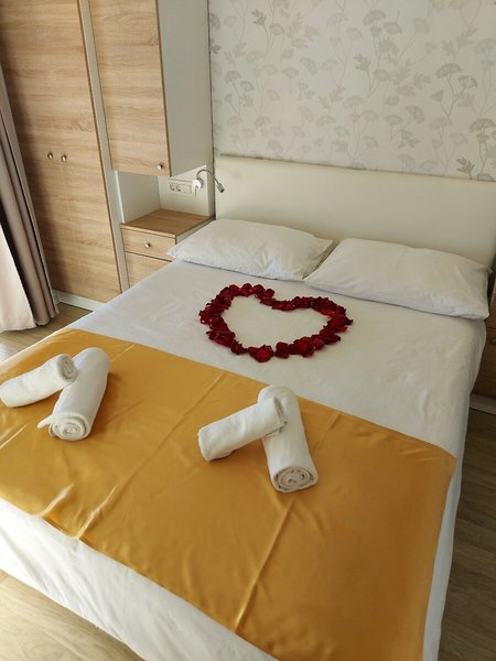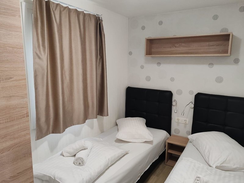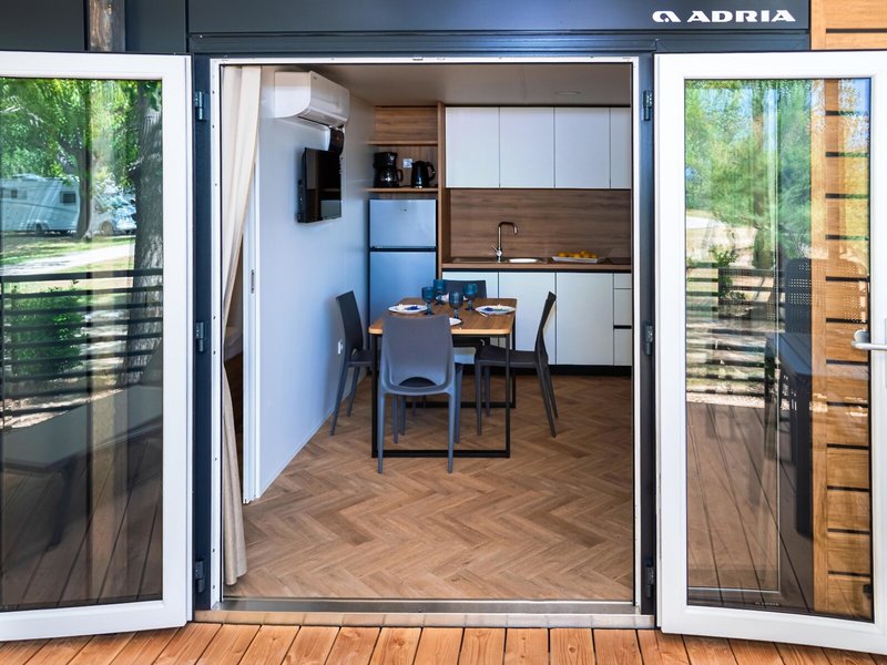 - MH Adria superior 4+1, C zone (MHX6), Mobile Home, ca. 34 m², letzte Komplettrenovierung 2025, Gesamtanzahl der Räume in diesem Zimmertyp: 3, Aufteilung wie folgt: kombiniertes Wohn-/Schlafzimmer, 2 Schlafzimmer, 2 Einzelbetten, 1 Doppelbett, 1 Schlafsofa, Babybett: gegen Gebühr, Anfrage & Reservierung notwendig, Klimaanlage: ohne Gebühr, Heizung, Fußboden: Laminat, Schreibtisch, Küche, Kühlschrank: ohne Gebühr, Gas/E-Herd, Mikrowelle, Wasserkocher, Esstisch, Internet: WLAN/WiFi: ohne Gebühr, Fernseher: Flatscreen, Dusche, WC, 2 Bäder, Terrasse: mit Sitzgelegenheit, Nebenkosten: Endreinigung: gegen Gebühr