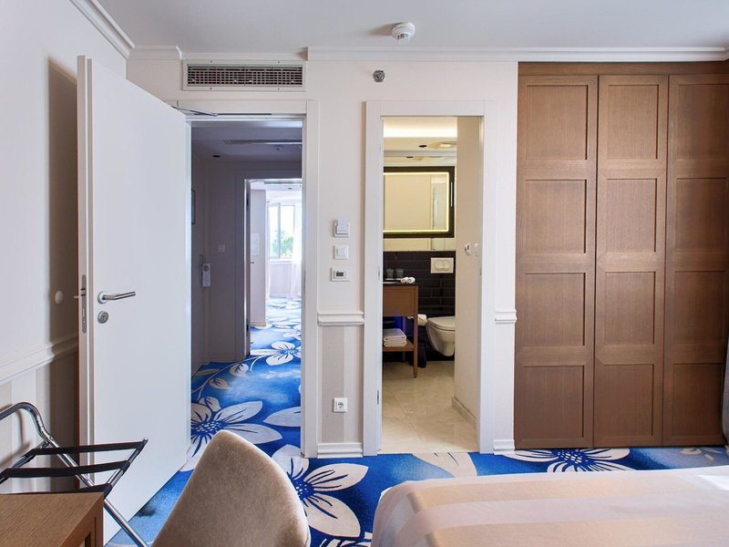 - Dvojlôžková izba Premium (DZM1), dvojlôžková izba, nefajčiarska izba, morská strana, výhľad na more, cca 20 m², 1 posteľ veľkosti king (180x200 cm), detská postieľka: cca 5 EUR za noc, nutná žiadosť a rezervácia, vzduch klimatizácia: individuálne nastaviteľná, centrálne ovládaná, Kúrenie: individuálne nastaviteľná, centrálne ovládaná, podlaha: koberec, trezor: zadarmo, písací stôl, kávovar/čajník, minibar: za poplatok, minibar dopĺňaný: denne, telefón, Internet: WLAN/ WiFi: zadarmo, TV: s plochou obrazovkou, nemecké programy, satelitná TV, izbová služba: za poplatok, vaňa alebo sprcha, WC, župan: zadarmo, papuče: zadarmo, sušič vlasov