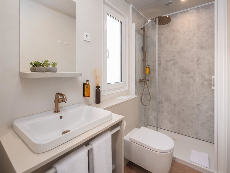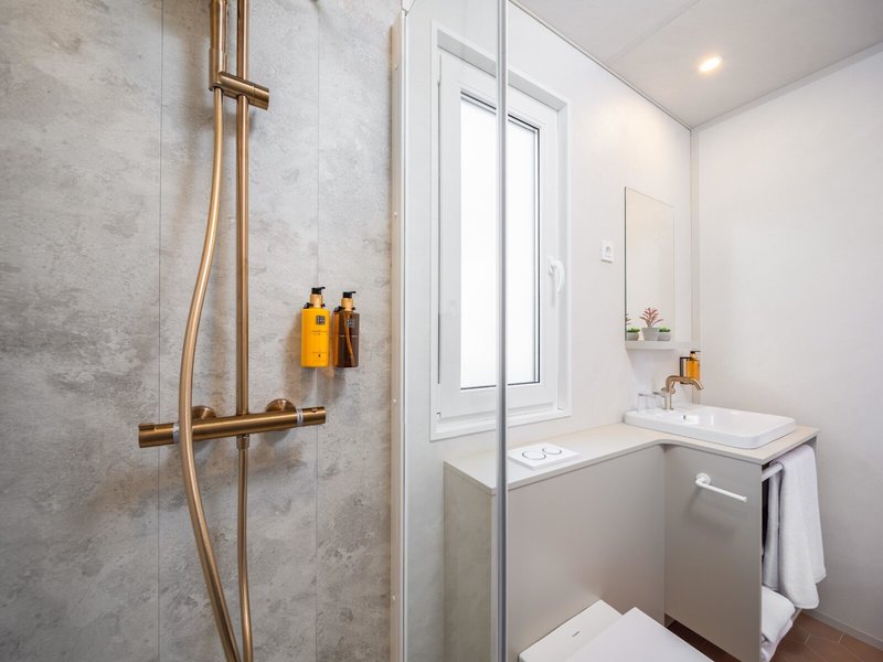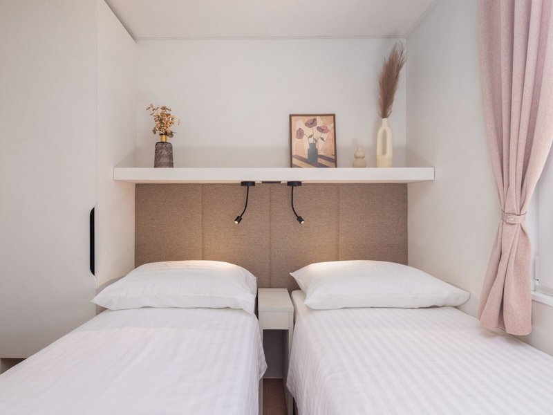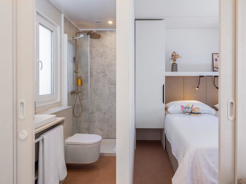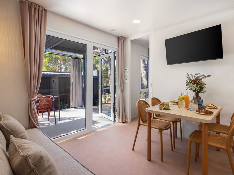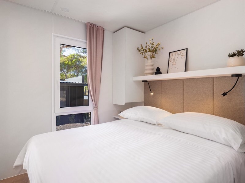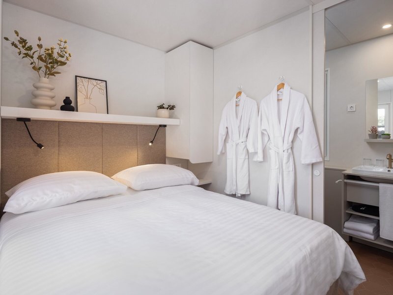 - Prémiový rekreačný dom (MHX3), mobilný dom, cca 32 m², posledná kompletná rekonštrukcia 2025, celkový počet izieb v tomto type izby: 3, rozloženie: obývacia izba, 2 spálne, 2 samostatné postele (80x200cm), 1 manželská posteľ (160x200cm), detská postieľka: zadarmo, na požiadanie a rezerváciu je potrebná, moskytiéra, klimatizácia: zadarmo, apríl - október, individuálne ovládané, kúrenie: sezónne, individuálne ovládané, trezor: zadarmo, pohovka, kuchynský kút, chladnička: zadarmo, plynový/elektrický sporák, umývačka riadu, kávovar/čajník, rýchlovarná kanvica, jedálenský stôl, internet: Wi-Fi: zadarmo, TV: plochá obrazovka, v obývacej časti, upratovacia služba: denne, zadarmo, sprcha, WC, 2 kúpeľne, fén, terasa: s ležadlami, s posedením