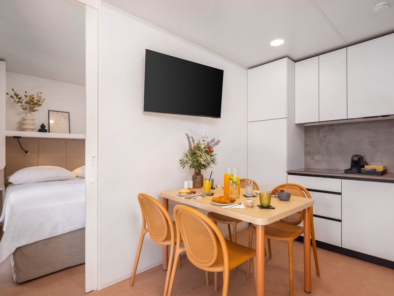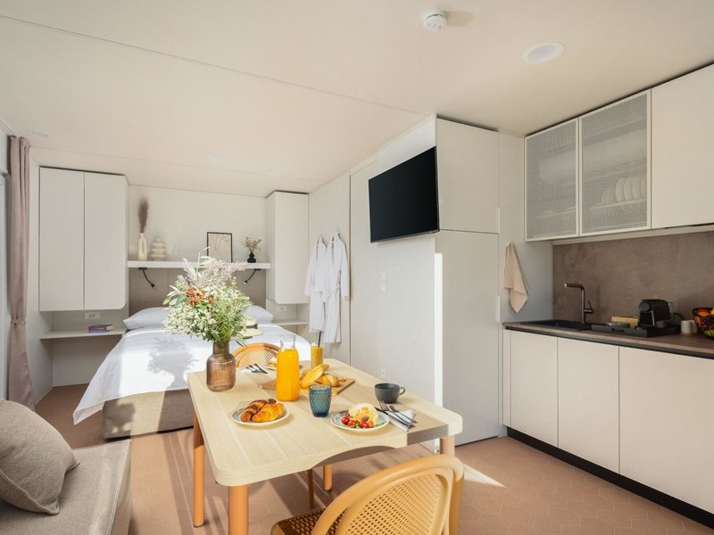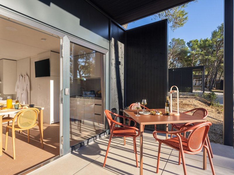 - Glamping Escape so súkromnou vírivkou (MHX1), mobilný dom, cca 22 m², posledná kompletná rekonštrukcia 2025, celkový počet izieb v tomto type izby: 1, rozloženie: kombinovaná obývacia izba/spálňa, 1 manželská posteľ (160x200cm), 1 rozkladacia pohovka, detská postieľka: zadarmo, nutná žiadosť a rezervácia, moskytiéra, klimatizácia: zadarmo, apríl - október, individuálne ovládané, kúrenie: sezónne, individuálne ovládané, trezor: zadarmo, kuchynský kút, chladnička: zadarmo, plynový/elektrický sporák, umývačka riadu, kávovar/čajník, rýchlovarná kanvica, jedálenský stôl, internet: Wi-Fi: zadarmo, TV: plochá obrazovka, upratovacia služba: denne, zadarmo, sprcha, WC, župan: zadarmo, papuče: zadarmo, fén, terasa: s ležadlami, s posedením, s vírivkou