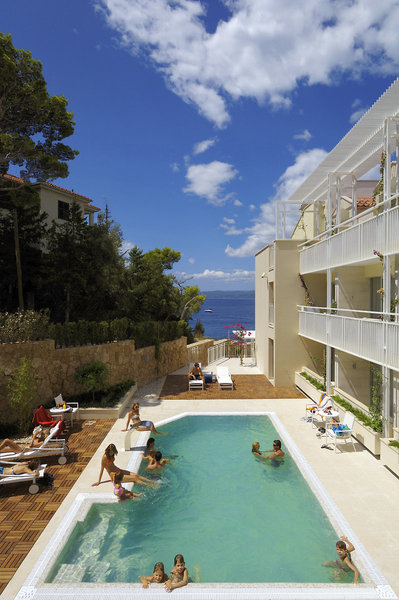 - Strand: felsig, Kies, naturbelassen, Badeplateau, öffentlich mit eigenem Hotelabschnitt