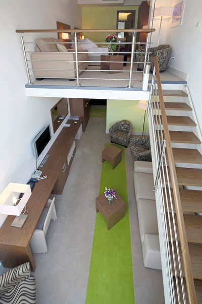 - 51-60 qm, Maisonette, Duplex, Meerblick, optisch getrennter Wohn-/Schlafraum, Sofabett, 2 Bäder, Dusche oder Badewanne, Whirlwanne, Haartrockner, Klimaanlage, Heizung, Minibar kostenpflichtig, Safe, TV, Wasserkocher, Kaffee/Tee, Balkon (möbliert)