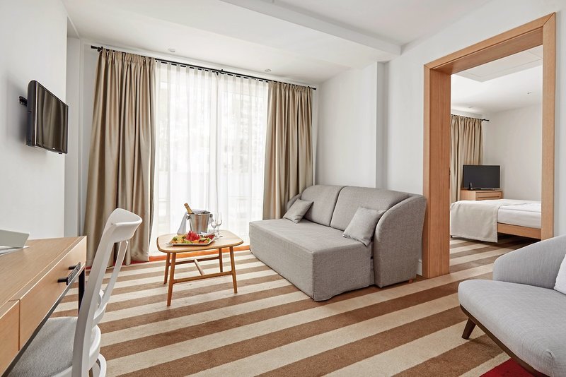 - Apartmán, posteľná bielizeň, uteráky a matrace zo 100% organickej bavlny, 1 samostatná spálňa, oddelená obývacia izba, písací stôl, manželská posteľ, rozkladacia pohovka, sprcha, WC, klimatizácia, minibar, trezor, TV