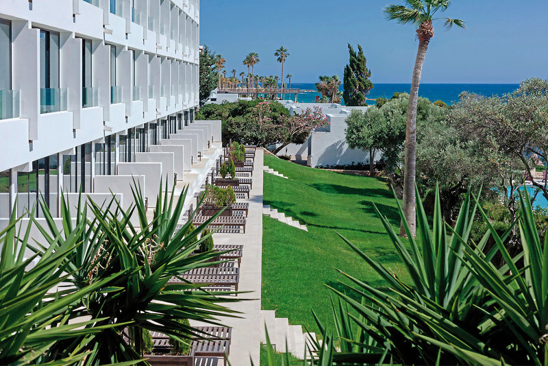 - 91-100 qm, Juniorsuite, mit Verbindungstür, Meerblick, 2 separate Schlafzimmer, kombinierter Wohn-/Schlafraum, Sitzecke, Doppelbetten (1 Doppel- oder 2 Einzelbetten), 2 Bäder, Badewanne, Regendusche, WC, Bademantel, Badeslipper, Haartrockner, Klimaanlage, Heizung, Minibar kostenpflichtig, Safe, TV (Smart-TV), Espressomaschine, Terrasse (möbliert), bei Ankunft im Zimmer Obstkorb, Wein, Wasser, sowie Zugang zu einer Dachterrasse mit Panoramablick auf den Hafen von Paphos