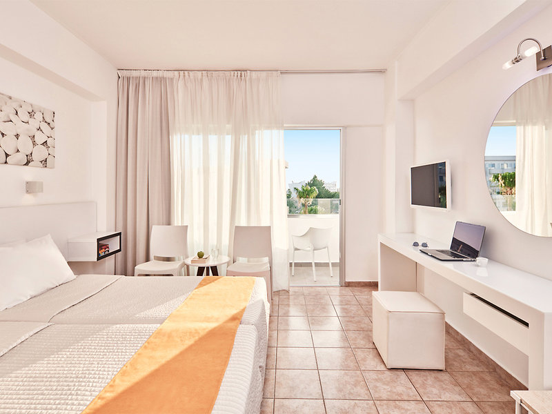 Wohnen: Doppelzimmer (DZ, ca. 21 qm), Klimaanlage, Minikühlschrank, TV, Telefon, WLAN, Mietsafe. Bad/Dusche, WC, Föhn. Balkon/Terrasse. Wahlweise mit Balkon und seitlichem Meerblick (DSS) oder direktem Meerblick (DZM). Max. 2E