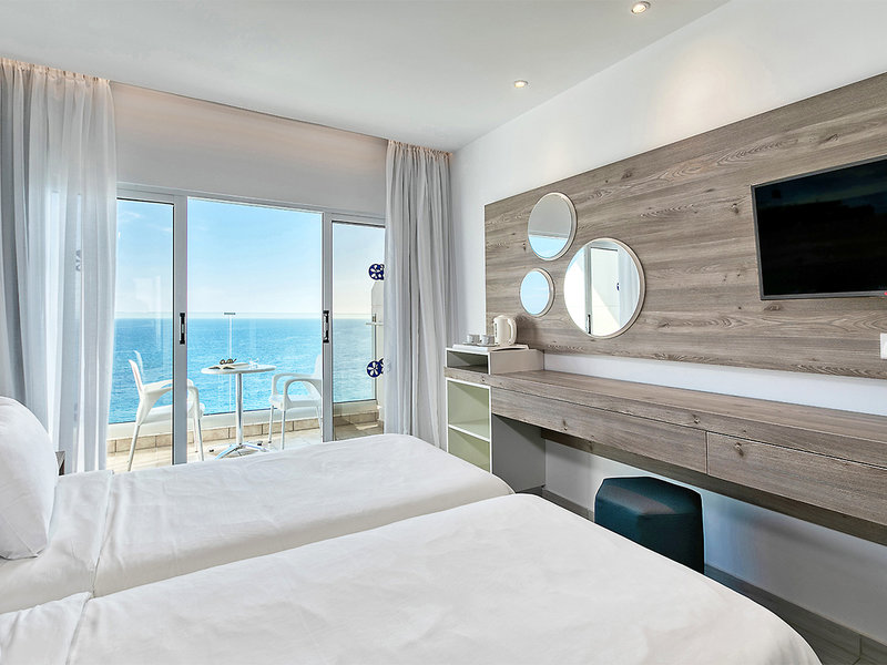 Superior Familienzimmer (FZS, ca. 27 qm), Klimaanlage, Kühlschrank, TV, WLAN. Telefon, Safe. Bad oder Dusche, WC, Föhn. Balkon/Terrasse, seitlicher Meerblick. Max. 3E+1K