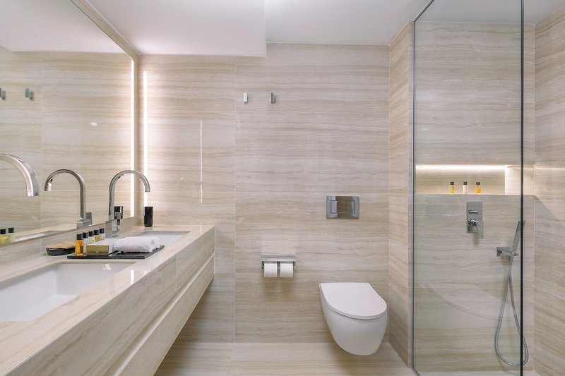 - 51-60 qm, Suite, Meerblick, kombinierter Wohn-/Schlafraum, Ankleidebereich, Sitzecke, Couch, Doppelbett (Kingsize), Whirlwanne, bodengleiche Dusche, separates WC, Bademantel, Badeslipper, Haartrockner, Klimaanlage, Minibar kostenpflichtig, Safe, TV (Smart-TV), Kaffee/Tee, Balkon (möbliert), Kopfkissen-Menü, separater Check-in & Check-out, bei Ankunft im Zimmer Obst, Wein, Wasser