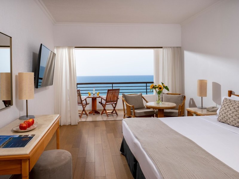- Studio Sea View (STM1), Studio, im Hauptgebäude, Meerblick, ca. 28 m², Gesamtanzahl der Räume in diesem Zimmertyp: 1, Aufteilung wie folgt: kombiniertes Wohn-/Schlafzimmer, 2 Einzelbetten, 1 Doppelbett, 1 Zustellbett, Babybett: ohne Gebühr, Anfrage notwendig, Klimaanlage: ohne Gebühr, zentral gesteuert, Heizung: zentral gesteuert, Fußboden: Teppichboden, Safe: ohne Gebühr, Kaffee-/Teezubereiter, Minibar: gegen Gebühr, Telefon, Internet: WLAN/WiFi: ohne Gebühr, Fernseher: Flatscreen, deutsches Programm, Sat-TV, Roomservice: gegen Gebühr, Reinigungsservice: ohne Gebühr, Badewanne oder Dusche, WC, Bademantel: ohne Gebühr, Slipper: ohne Gebühr, Föhn, Balkon oder Terrasse: mit Sitzgelegenheit