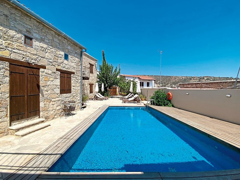 Information: Die Anlagen Porfyrios in Choirokoitia, Evkarpos in Psematismenos und Eveleos in Tochni sind ehemalige Dorfhäuser, welche komplett restauriert und im typisch zypriotischen Stil mit viel Liebe zum Detail wieder hergerichtet wurden. Porfyrios: 2 mit Naturstein gebaute, doppelstöckige Dorfhäuser mit 6 Wohneinheiten. Evkarpos: Dorfhaus mit 5 Wohneinheiten. Eveleos: 2 Dorfhäuser mit 10 Wohneinheiten, um einen Innenhof gruppiert. In jeder Anlage Gemeinschaftspool (10 x 5 m bzw. 11 x 5 m) mit Sonnenterrasse, Liegen und Sonnenschirmen, Parkplatz.