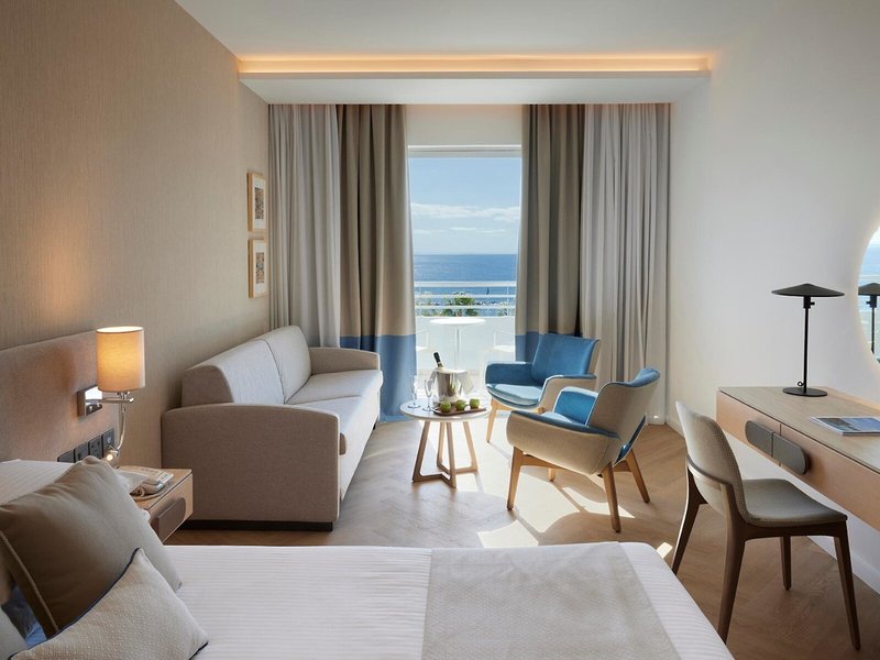 • Junior Suita Pool Sea View (JSM1), štúdio, minimálny vek v izbe: 16 rokov, strana bazéna, výhľad na more, cca 41 m², posledná kompletná rekonštrukcia v roku 2022, posledná čiastočná rekonštrukcia v roku 2012, celkový počet izieb v tomto type izby: 1 , dispozičné riešenie: kombinovaná obývačka -/spálňa, 1 manželská posteľ, klimatizácia: individuálne nastaviteľná, centrálne ovládaná, studená, teplá, podlaha: koberec, parkety, trezor: bez poplatku, posedenie, pohovka, kávovar/čajník, minibar : za poplatok, nealko: za poplatok, voda: za poplatok, alkoholické nápoje: za poplatok, plnenie minibaru, telefón, Internet: WLAN/WiFi: bez poplatku, TV: plochá obrazovka, v obývacej časti, v spálni, nemecké kanály, satelitná TV, rádio, dokovacia stanica pre iPod, izbová služba: za poplatok, denná tlač: bez poplatku, vaňa, WC, župan: bez poplatku, papuče: bez poplatku, fén, balkón s posedením