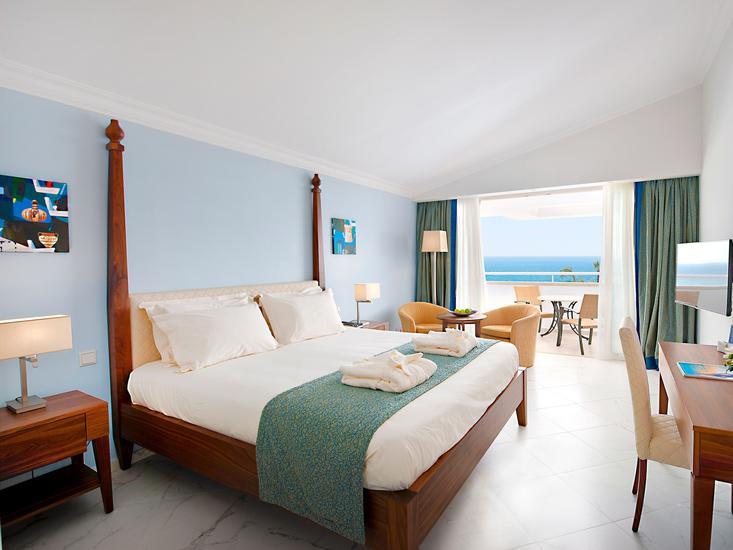 Deluxe Zimmer (Pool-Meer-Blick, Balkon): Klimaanlage (indiv. steuerbar), Minikühlschrank. Wasserkocher, Handtücher. TV, Telefon, Internet, Safe. Bad oder Dusche/WC, Föhn, Bademantel. Balkon. Max. 3E.