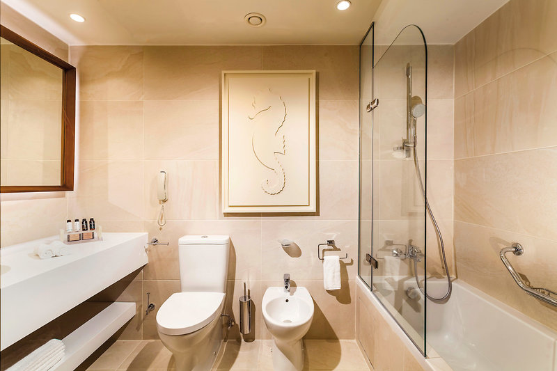 - 26-30 m2, dvojlôžková, štandard, hlavná budova, výhľad na more, manželské postele (1 queen size alebo 1 twin), vaňa, WC, župan, papuče, sušič vlasov, klimatizácia, minibar za poplatok, trezor, TV, rýchlovarná kanvica, káva/čaj, balkón (zariadený), voda na izbe pri príchode