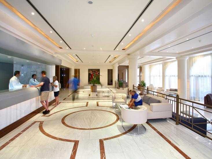Ausstattung: Garten, Poollandschaft mit 3 Pools, Kinderpool. Liegen, Schirme am Pool und am Strand (geg. Geb.), Handtücher am Pool (geg. Geb.), Beach-Bar, Pool-/Snackbar, Sonnenterrasse. Empfangshalle, Rezeption, Lobby-Bar, Safe (geg. Geb.), TV-Lounge. 7 Restaurants (Buffet & à la carte) mit nationalen, internationalen, italienischen, mediterranen und asiatischen Speisen, Terrasse, 5 Bars, Shop, Parkplatz (geg. Geb.). 282 Zimmer, 6 Etagen, 4 Lifte.